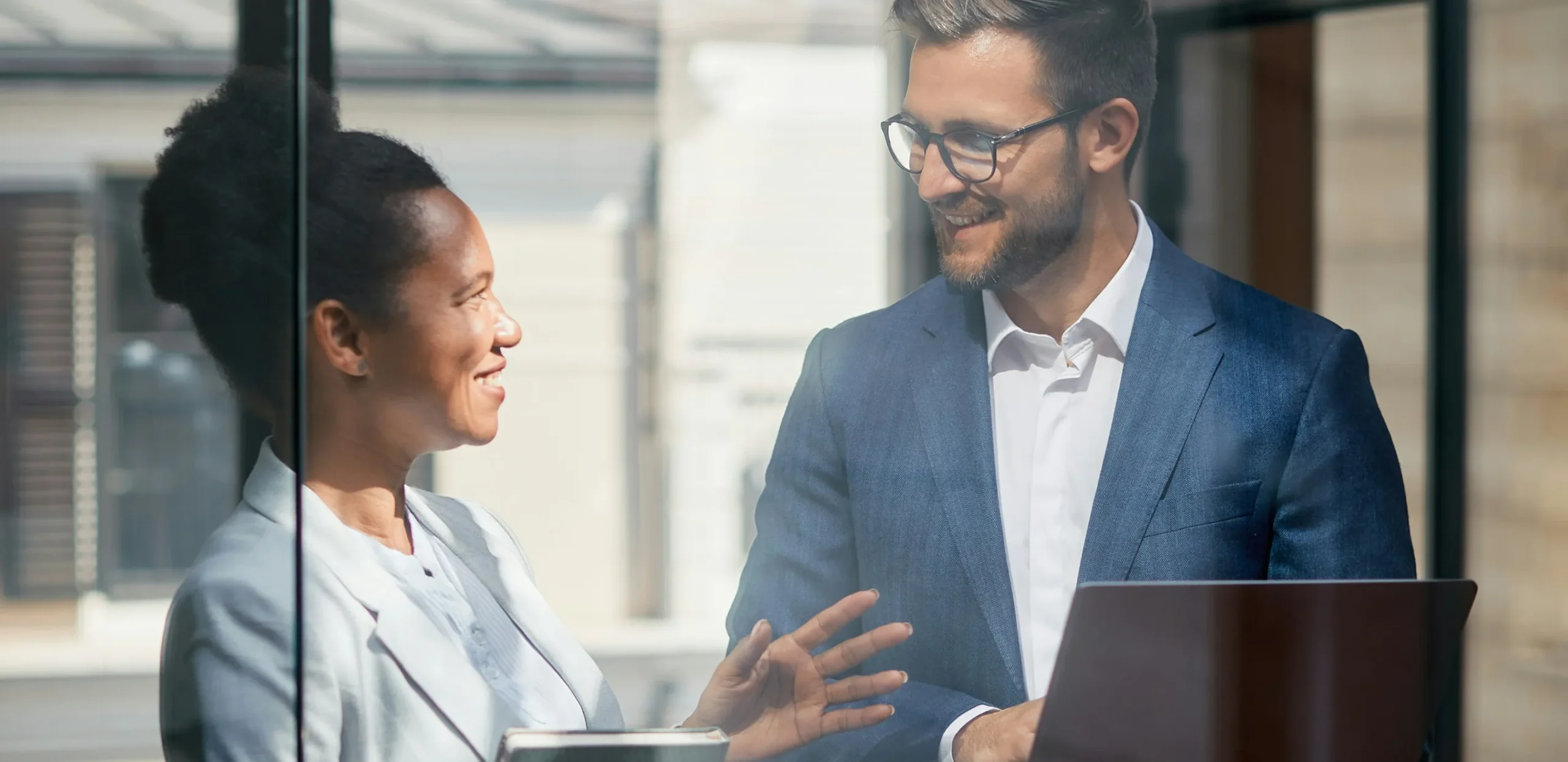 Das Bild zeigt zwei Business-Professionals in einem modernen Büro mit Glaswänden. Eine junge Frau in grauem Business-Anzug hält ein Tablet und gestikuliert während eines Gesprächs. Ihr gegenüber steht ein Mann mit Bart und Brille im blauen Anzug mit weißem Hemd, der einen Laptop hält und lächelt.